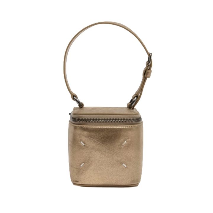 サイコロのようなフォルムにフォイル加工が施され、唯一無二の存在感を放つミニバッグ。ブレスレット感覚で、手首に通して持つのもスタイリッシュ! フロントに施されたブランドシグネチャーの4本の白いステッチが、モードなアクセントに。
