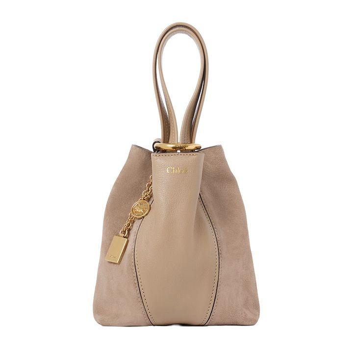 さまざまな持ち方が可能な“クロエ スピン”の新色は、ソフトなスエードとシボ感のあるレザーのコンビで立体感を表現したピンクベージュ。リングで口を絞ってシルエットの異なるハンドキャリースタイルにアレンジできるほか、付属のストラップを取り付ければクロスボディにも変身。
