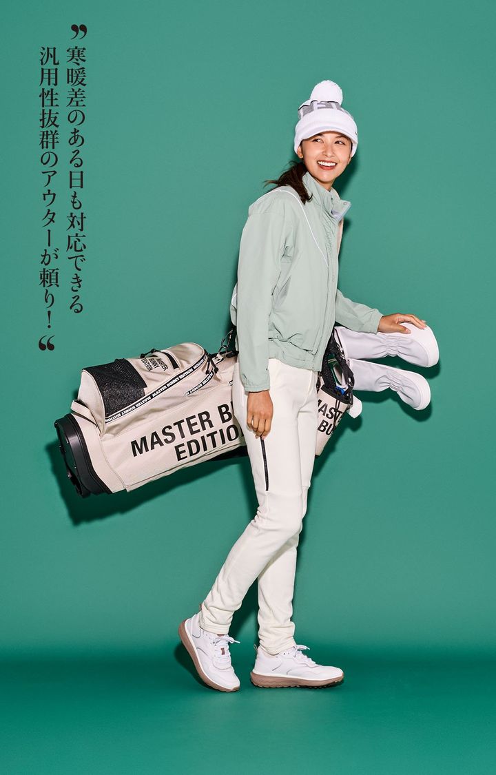 ブルゾン¥31,900(テーラーメイドアパレル/テーラーメイドゴルフ)パンツ¥25,300(ジュンアンドロペ)ニットキャップ¥6,050(トミーヒルフィガーゴルフ/ヤマニ)キャディバッグ¥71,500(マスターバニーエディション)ソックス¥1,760(ジャックバニー!!)シューズ¥27,500(コールハーン×ユナイテッドアローズ/ユナイテッドアローズ日本橋店)