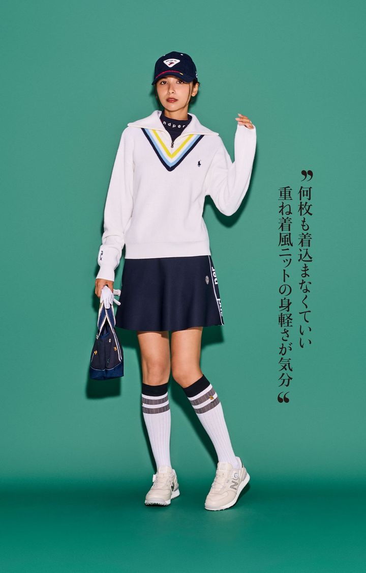 ニット¥50,600(ポロラルフローレンゴルフ/ラルフローレン)中に着たモックネックシャツ¥13,200、スカート¥17,600、キャップ¥6,050(以上アンパスィ)バッグ¥9,900(ビームスゴルフ/ビームスゴルフ有楽町)グローブ〈片手〉¥2,420(アディダスゴルフ)ソックス¥3,740(パーリーゲイツ)シューズ¥19,800〈編集部調べ〉(ニューバランス/ニューバランスジャパン)