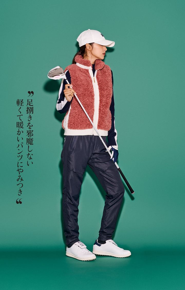 冬ゴルフに冷えは大敵。でも着膨れして身体感覚が狂うのはもってのほかだから、上下細身のミニマルな合わせにベストをオンして、首まわりと背中の暖かさを確保して。