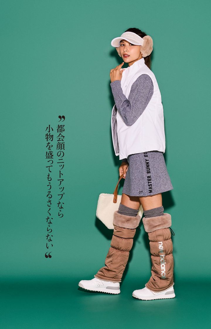 ニット¥35,200、スカート¥30,800(共にマスターバニーエディション)サンバイザー¥5,940、レッグウォーマー¥7,920(共にニューバランスゴルフ/TSIニューバランスゴルフセクション)ベスト¥22,000(アルティコア/ブリヂストンスポーツ)バッグ¥9,350(ビームスゴルフ/ビームスゴルフ有楽町)ソックス¥2,640(ジャックバニー‼︎)シューズ¥19,800〈編集部調べ〉(ニューバランス/ニューバランスジャパン)