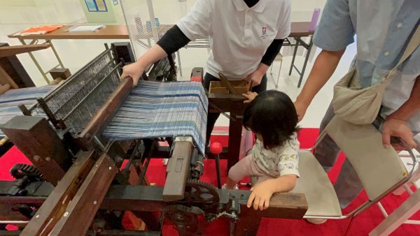 織物体験コーナーもあり、明治初期にタオルを織り始めた織機とその後明治末期から大正時代の織機2台の体験ができるようになっていました。希望する場合は名前を書いて順番を待ちます。子どもがたくさん体験していました。