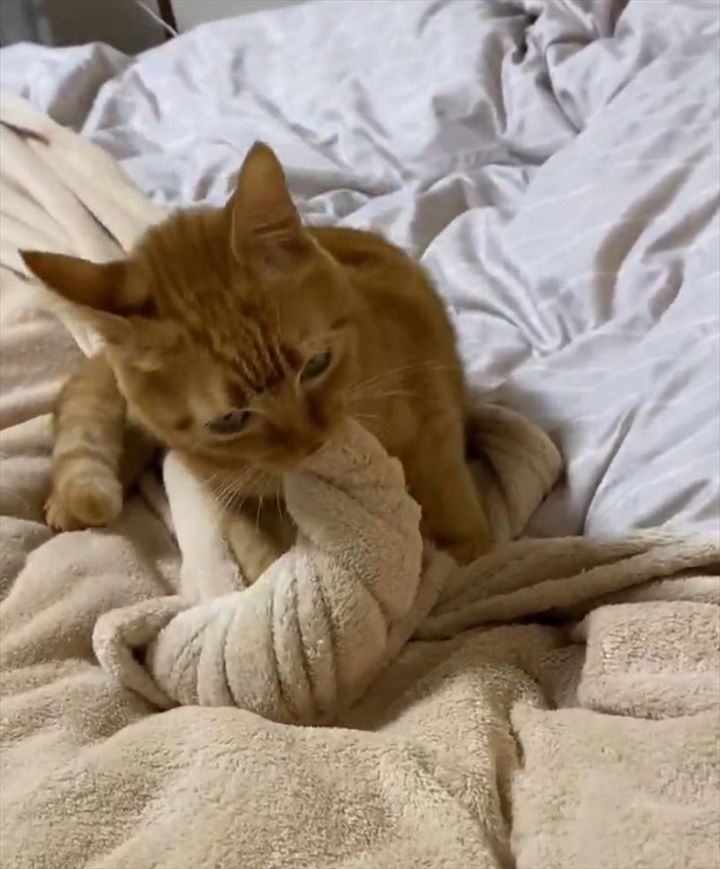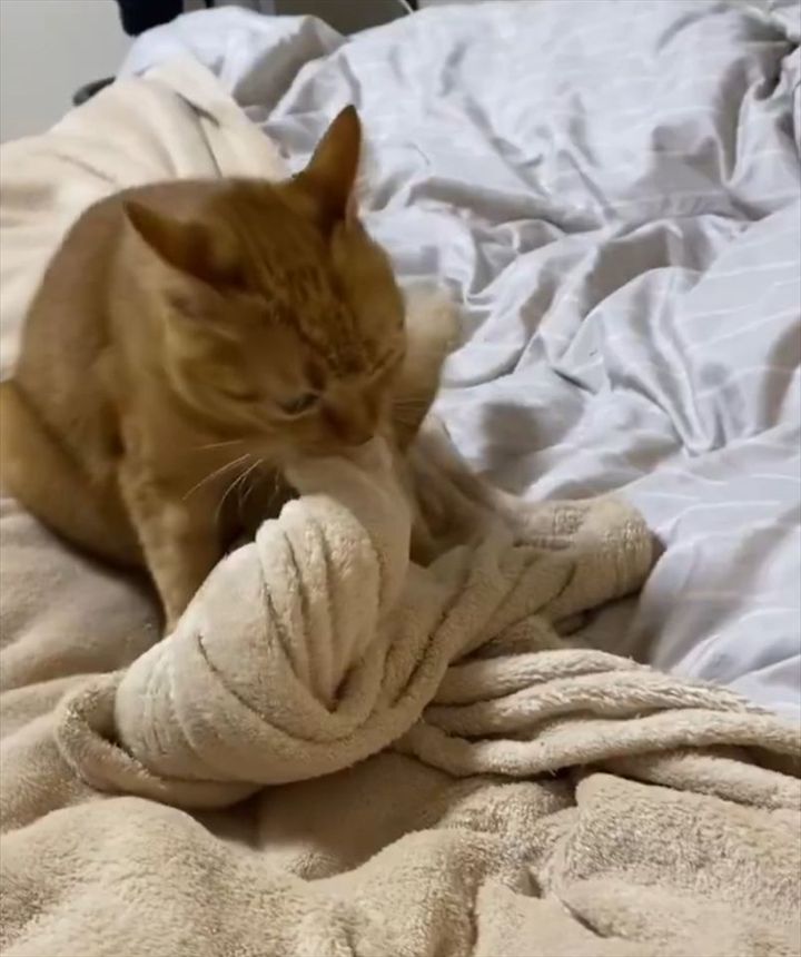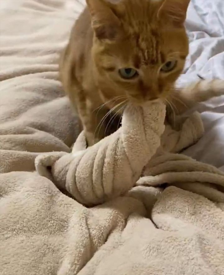 ネコが静かだなと思ったら・・。タオルケットをねじねじして特大ソフトクリームを作っていた!?「ねじねじ職人さん」「後ろ脚もふみふみして一生懸命作ってる」