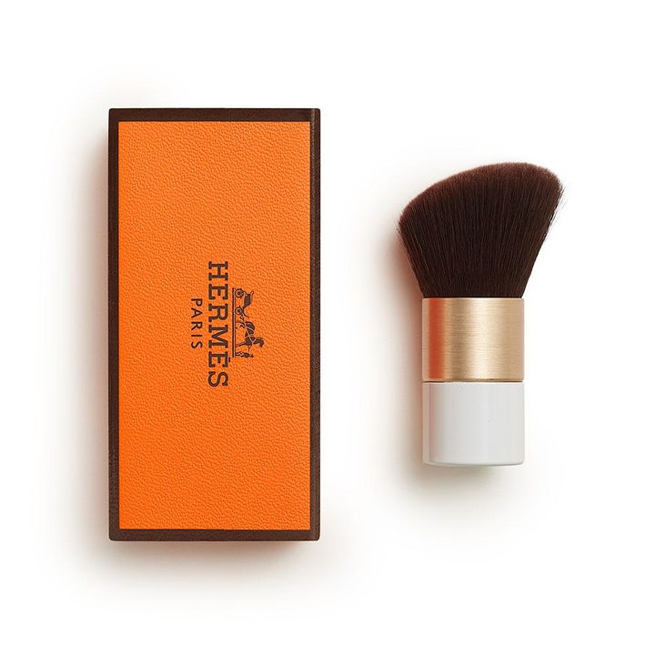 心ときめくオレンジのボックスにセットされたのは、コンパクトなフェイスパウダー用ブラシ。斜めにカットされたフォルムで、さまざまなアプライを可能にしている。「エルメス」のビューティアイテムに共通する、ヘアライン仕上げとラッカー仕上げを施したバイカラーのデザインがどこまでもラグジュアリー。持ち運びに便利なトワル地のポーチが付属。
