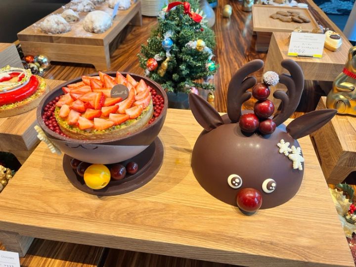 最後に見た目がとってもかわいいケーキをご紹介。「クリスマス ディアー ショコラ ウィズ リンツチョコレート」は、リンツチョコレートでできた大きなトナカイの中に、なんと苺のタルトが隠れているスペシャルなデコレーションとなっています!クリスマスパーティーの主役になること間違いなしのこちらのケーキは7個限定なので、気になる方はお早めにご予約を!