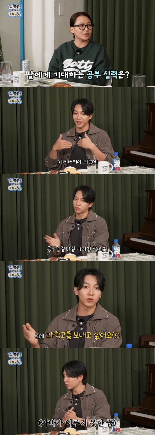 「娘にどれくらいの学力を期待しているのか」と聞かれたイ・スンギは「勉強ができなくてもいいと思うけど、科学高校には行かせたい」と矛盾した考えを言い、スタジオを笑わせた。