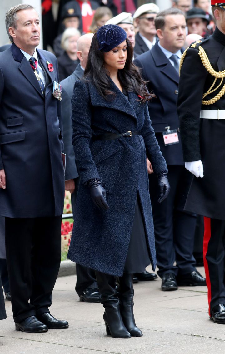 さらに、2019年にウェストミンスター寺院で行われたリメンブランス・デーの式典でもセントーラーを選び、汎用性の高いネイビーのコートで参列した。ベルトマークしてよりスマートに。