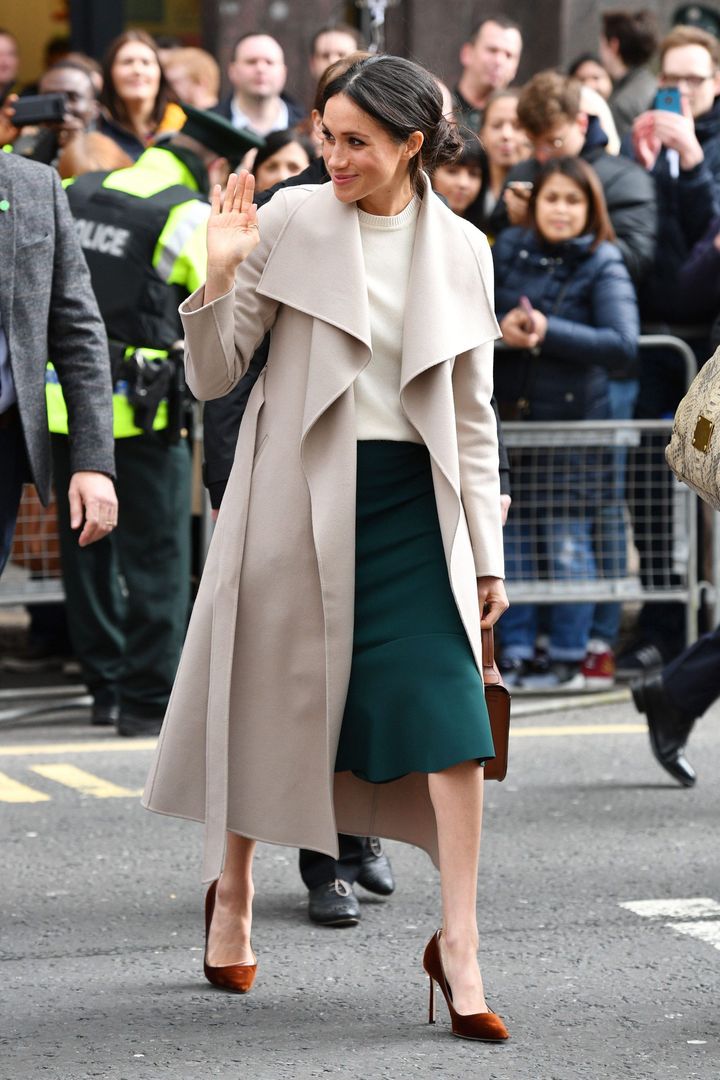 “ラップコートの名手”でもあるメーガン妃は、2018年にマッカージュのラップコートをまとってアイルランドのベルファストを訪問。ベルトできっちり閉じず、あえてゆるやかに流れるように着こなすのがメーガン流。