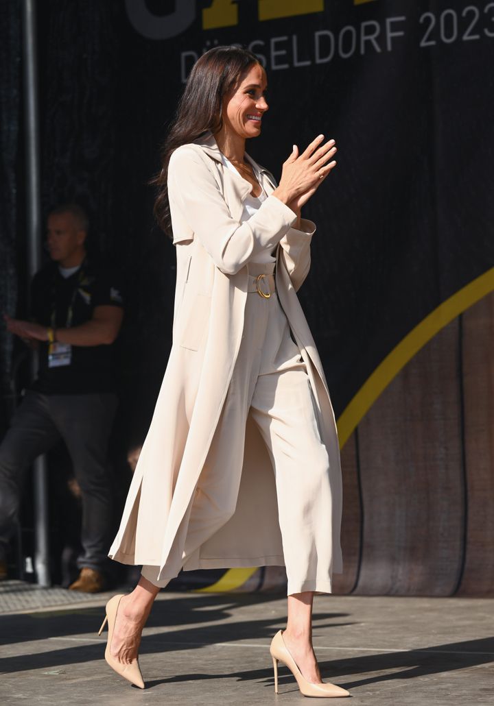 2023年にドイツ・デュッセルドルフで開催されたインビクタス・ゲームズにて。水泳競技の授賞式では、シックなシルク素材のトレンチコートを着用し、注目を集めた。こちらは、愛用ブランドのひとつであるクヤナのもの。