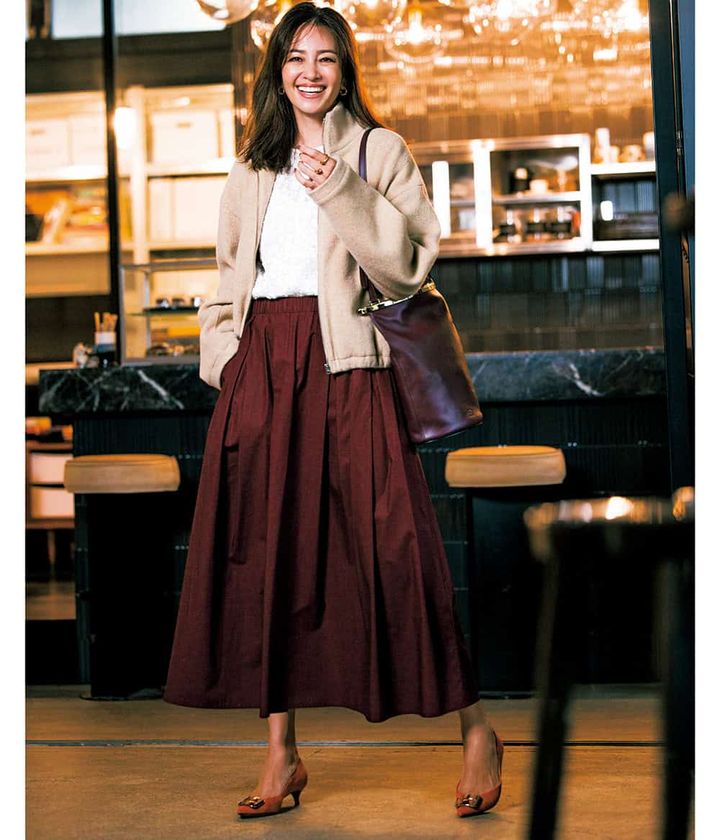 カシミアフリースブルゾン¥61,600(ロンハーマン/ロンハーマン)レースブラウス¥39,600(yori)スカート¥46,200(スタイリン/ユナイテッドアローズ 渋谷スクランブルスクエア店)バッグ¥322,300(トッズ/トッズ・ジャパン)パンプス¥79,200(ペリーコ/アマン)ピアス¥56,100リング¥49,500(ともにASAMIFUJIKAWA/ショールーム セッション)