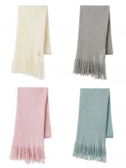 ふんわりとした肌触りとほどよい厚みで、冬の首元にぬくもりをプラス。ラインストーンのロゴが、上品にきらめいて女性らしい華やぎを演出。同色でお作りしたニットグローブとセットでお渡しするのもオススメ。