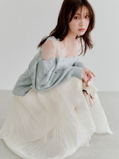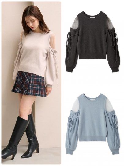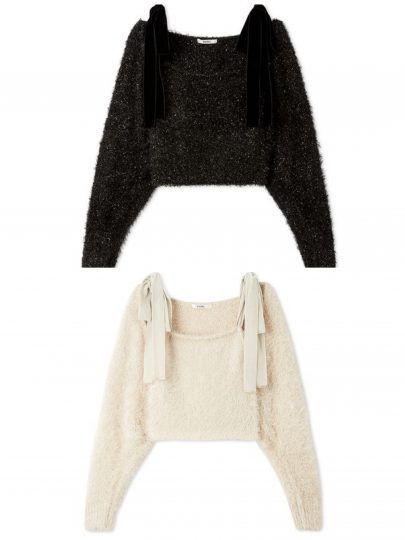 毛足感のある柔らかなニットの肩先を大胆にカットし、同系色のチュールをのぞかせて抜華奢な2本のニットリボンをオン。華やかで抜け感のあるスタイルがこの1枚で完成します。