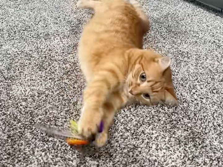 人間の年齢だと40代相当だけどこのキレ! おもちゃで大はしゃぎする茶トラさん