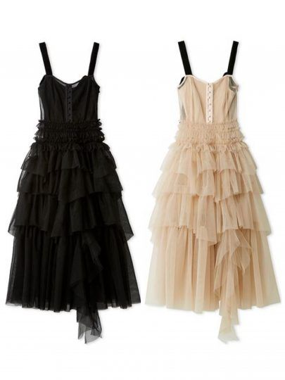シアー感のあるチュールをランダムに重ねたドラマティックなドレス。トップス部分はキャミソールデザインでストラップには太めのベロアリボンを使用。