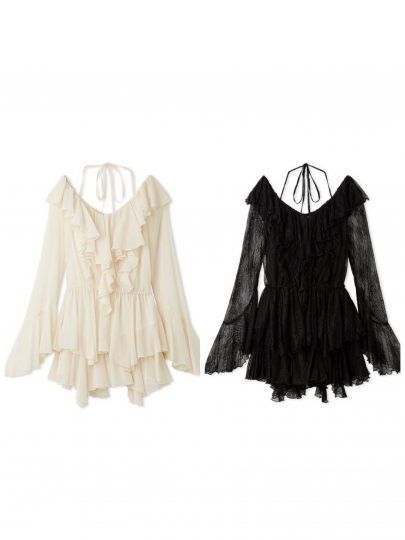 フリルトップスとミニスカショーパンのセットアップアイテム。チュニック丈のトップスはゴム入りの襟元でオフショルダーとしても着用可能。ホルターネックのインナーキャミソール付きで安心です。