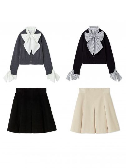 ニットプルオーバーは胸元にシャツ地のボウタイリボンとカフスをドッキング。顔周りや手首を華やかに演出し、ニットカーディガンを重ね着したようなデザインで、もたつかずにスッキリ着られます。