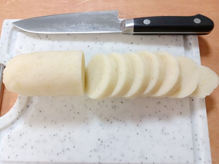 3. じゃがいもを手で細長くしたらラップに乗せて、棒状になるように包む。冷めたら1cm幅に切る。