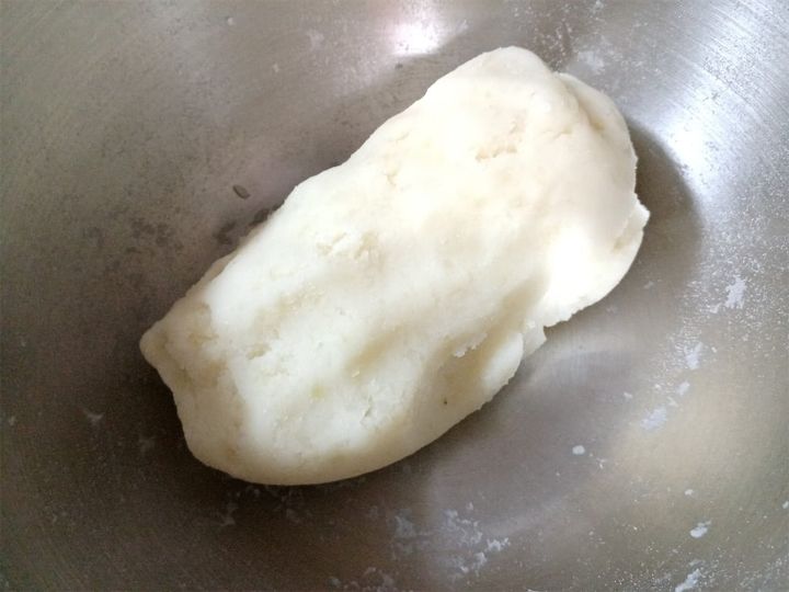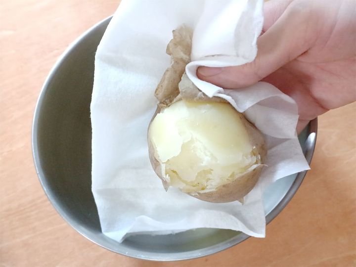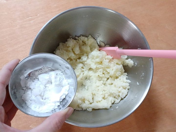 2. キッチンペーパーでじゃがいもを包むようにして皮を剥き、熱いうちにマッシャーやめん棒などでつぶす。全体がなめらかになったら、片栗粉を少しずつ混ぜ合わせ、耳たぶほどの硬さにする。