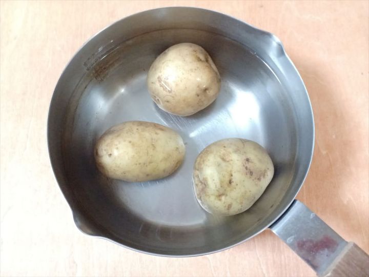 1. 鍋にじゃがいもを入れて、かぶるくらいの水を注いで中火で加熱する。沸騰したら弱火にし、竹串が通るまで加熱して火から下ろす。