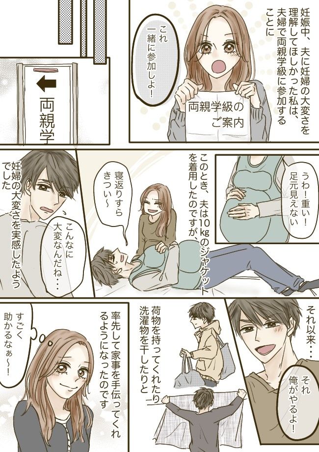 妊娠中の足元の見えにくさや、体のバランスのとりにくさなど、実感したおかげで、それからは荷物を持ってくれたり、洗濯物を干したりと、率先して手伝ってくれるようになりとても助かりました。