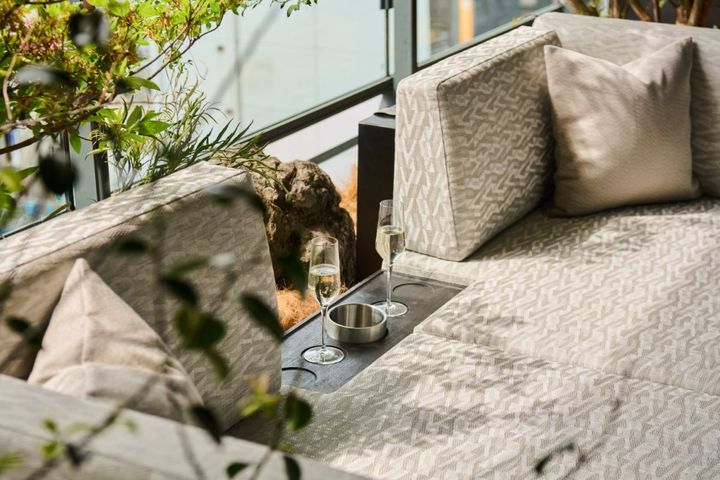 最上階のルーフトップラウンジ「ゆそら」は、屋上庭園に、同じく熱海から運んだ天然温泉の足湯を設えた特別な空間。木々に囲まれたプライバシーの高い空間には個別に足湯を設け、銀座の空気と空を見て、心地良い音楽とともにくつろげます。