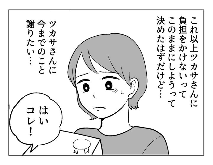 引っ越しの前日、なんとツカサさん自らチヒロさんを訪ねて来てくれたのです! しかも贈り物までくれて……。せっかくのチャンスです。チヒロさんはツカサさんに今までのことを謝ろうと思いますが、うまく言葉が出てきません。なんて言ったらこの気持ちが伝わるんだろう……。ツカサさんに負担をかけないように謝るにはどうすればいいんだろう……。ツカサさんが帰ってしまいますよ! チヒロさん、頑張って!!!