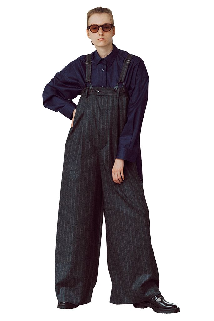 チャコールグレーサロペット、ネイビーシャツ、シューズ/以上SACRA(インターリブ) サングラス/PROJEKT PRODUKT(エディット フォー ルル)