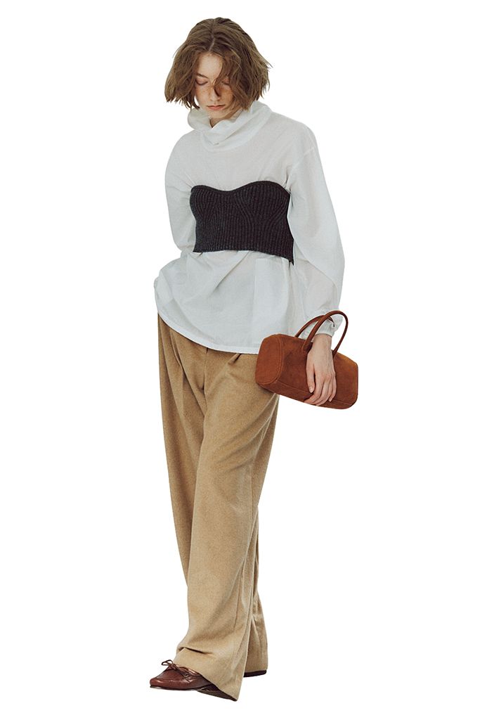 濃紺×深いグレーのトラッドな配色をベースに、インテリな表情をキープ。胸下までとどくハイウエストパンツでIラインを強調すれば、テクニック不要でスタイルアップものぞめる。気品をおぎなう起毛感のあるウール地。