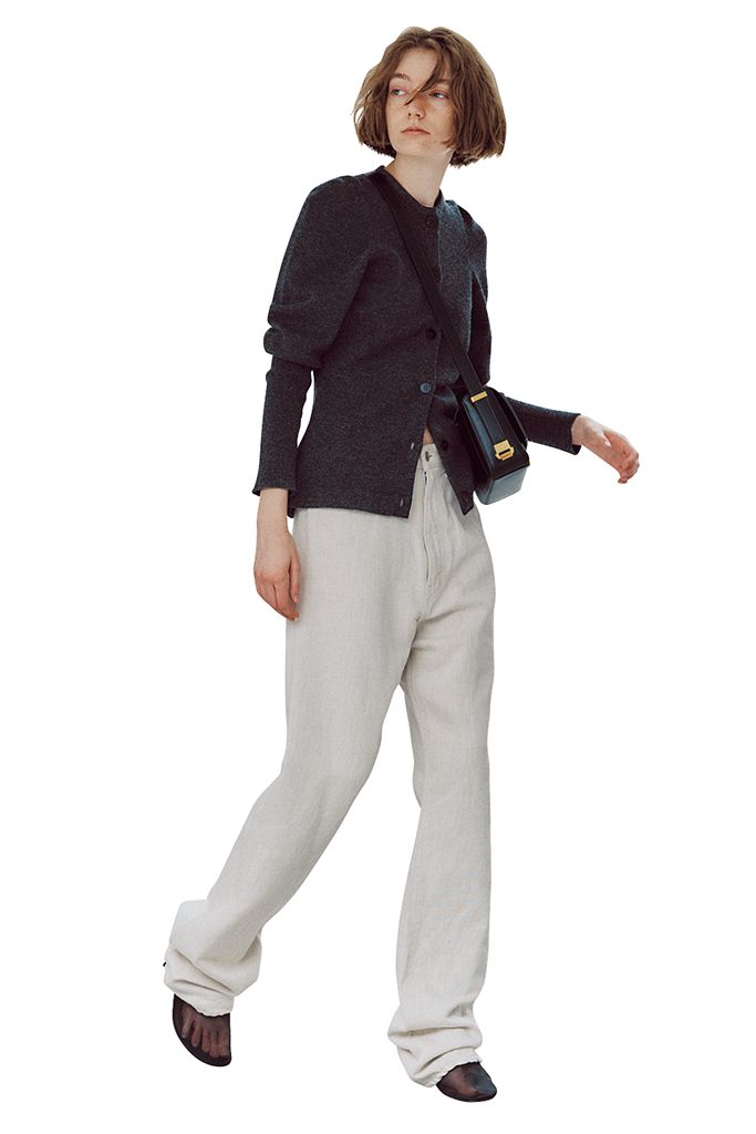 肩幅の華奢見せがかなう、ひかえめなボリュームスリーブが特徴。構築的な形により攻めた見た目になりがちなぶん、配色は無彩色でまとめるのが賢明。