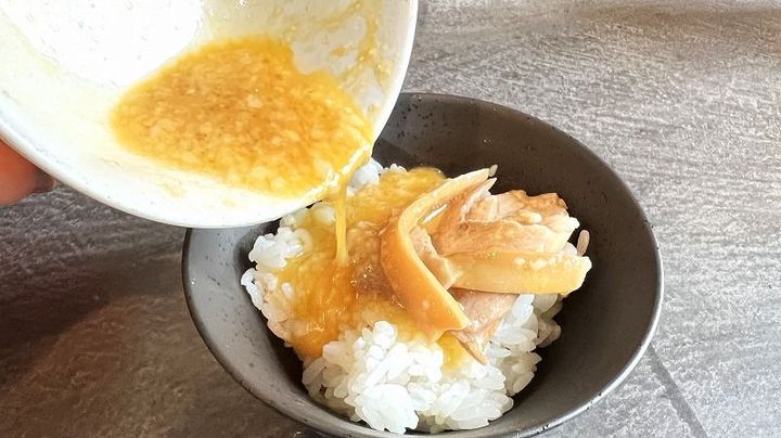 少し具材も残しておいて、生卵ブーストも一緒にすべてごはんにかけると…