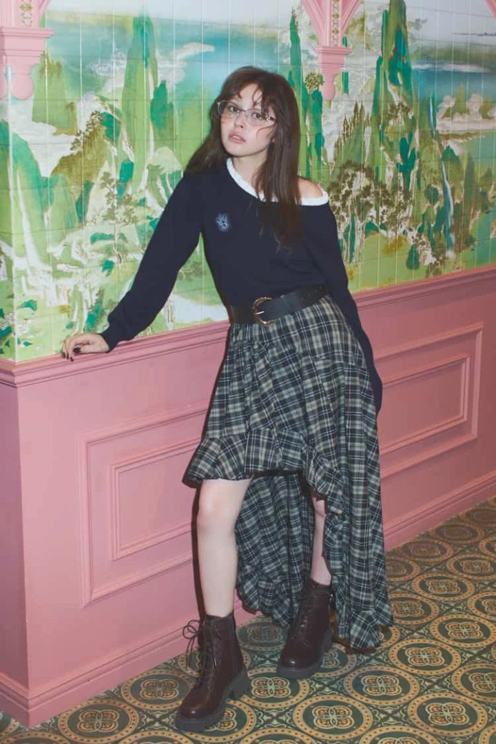 アシンメトリーなカットラインを、 軽やかシフォンが包み込むチェックスカートは品行方正でいて、色気たっぷり。ベルトやブーツでピリッと引き締めて媚びない“オタクマインド”をひとさじ。