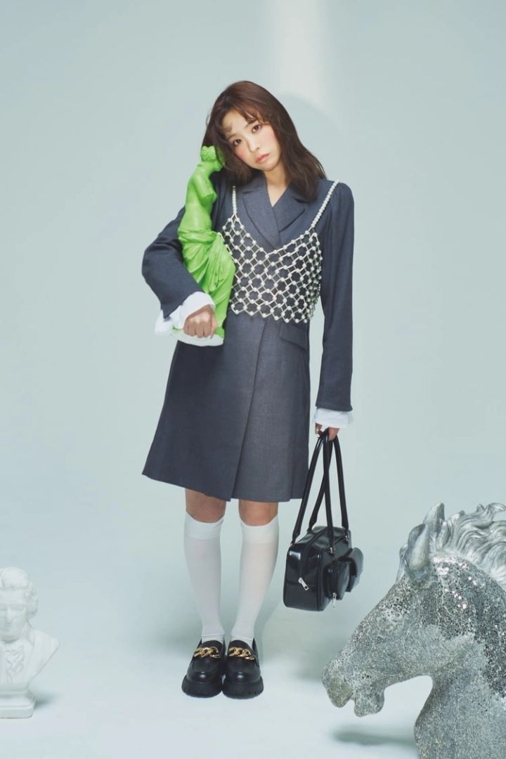 グレージャケット風ワンピース 19,910円/RANDA パールビスチエ 3,850円/レトロガール(R1000)バッグ 3,959円/WEGO ハイソックス 990円/靴下屋(Tabio)ローファー 2,699円/GRL