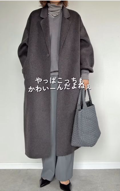 コートとインナー、パンツのトーンを同系色で揃えることで、奥行きのある洗練された印象に仕上がっています。