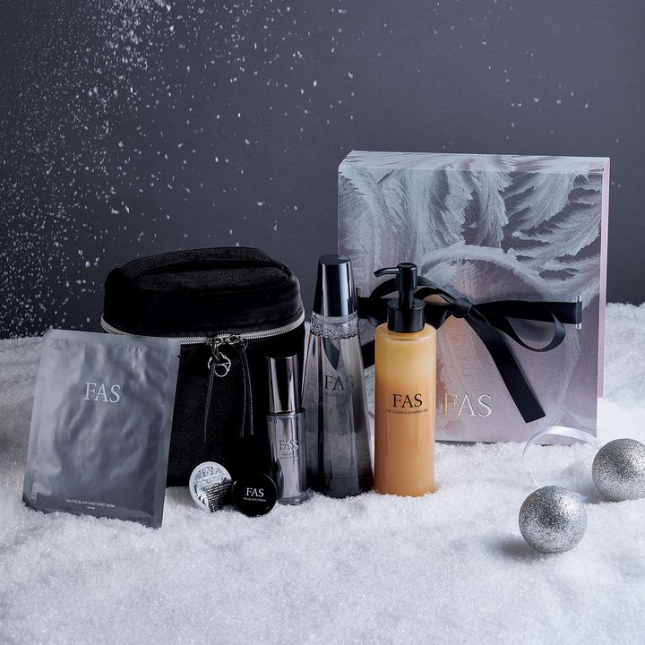 9月に発売した話題のアイクリーム「ザ ブラック リフト アイ クリーム」に大人気クレンジングジェル、みずみずしさが持続する化粧水「ザ ブラック エッセンス」が現品で入った豪華なコフレ。クリームやマスクのミニサイズにシートマスクもセットされ黒米発酵液のパワーをフルラインで堪能できる。バニティポーチは日常使いに便利。FAS プレミアム ホリデー コフレ 2025 ¥33,990(シロク)