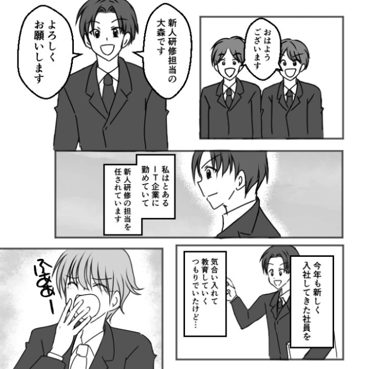 主人公はIT企業で働くアラサー男子。毎年新人研修を担当しているのですが、今年は様子がおかしい人間がいるようで・・・。
