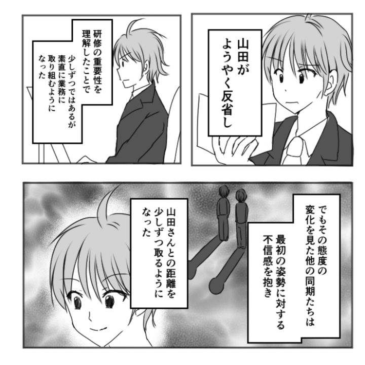 少しずつ真面目に仕事をするようになった山田ですが、一度失った同期からの信頼はなかなか取り戻せそうにありませんでした。