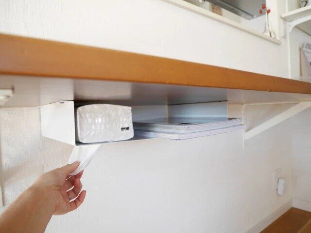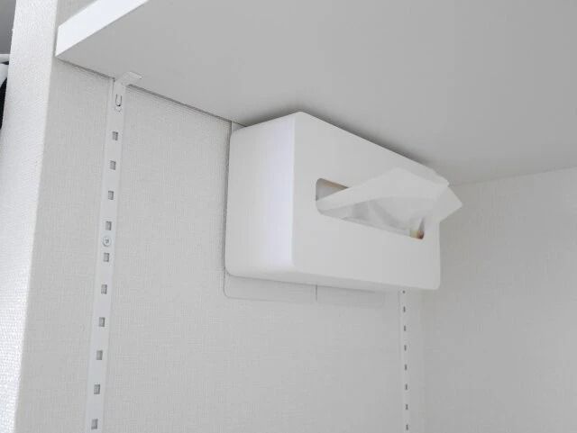 100均のブックエンドを逆さにして棚などのすき間に差し込み、その上にティッシュケースを取り付ければ、マグネットが使えない場所でも設置できますよ!