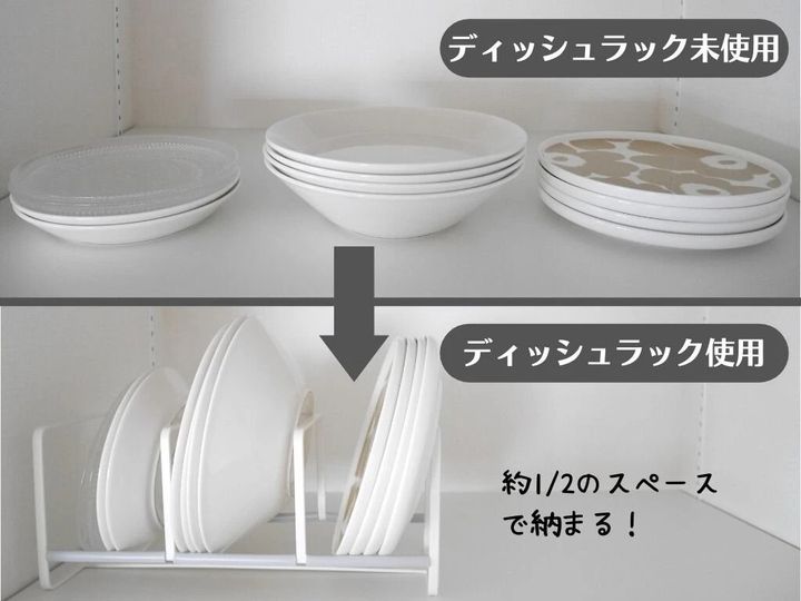 お皿の種類やサイズ別に、食器棚にキレイに収納できます。下に滑り止めシートを敷くと、スタンドが固定されてさらに使いやすいですよ!