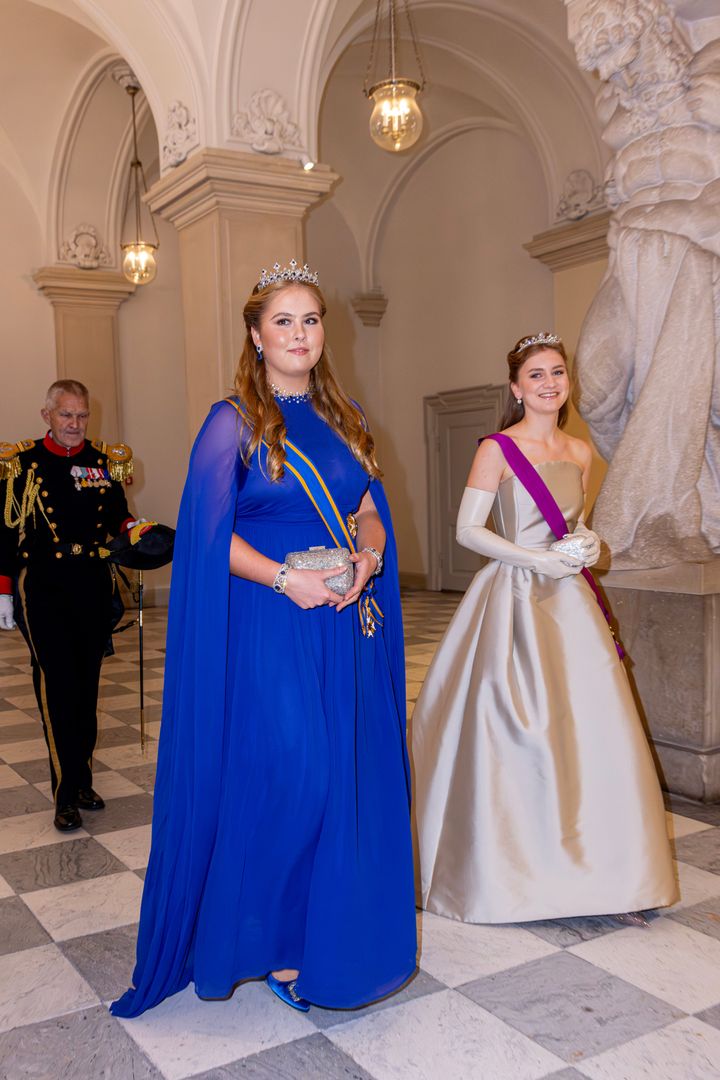 2023年10月、デンマークのクリスチャン皇太子の18歳の誕生日を記念したガラにて。カタリナ=アマリア王女はブルーのケープドレスを、エリザベート王女は光沢感のあるナタンのベージュドレスを着用。ともにティアラを合わせ、未来の女王の風格を漂わせて。