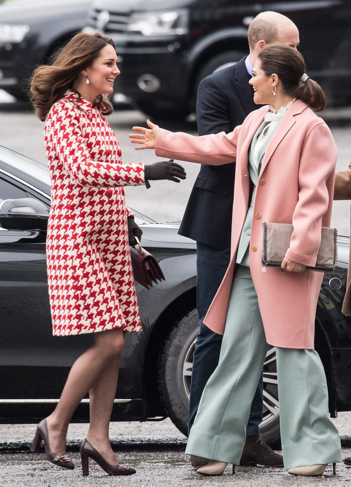親しげに挨拶を交わすこのシーンは、2018年1月、英国皇太子夫妻の北欧ツアー時に撮影されたもの。キャサリン皇太子妃は、キャサリン・ウォーカーの千鳥格子のコートを、ヴィクトリア皇太子はミントグリーンのスーツにパステルピンクのコートを重ねて。