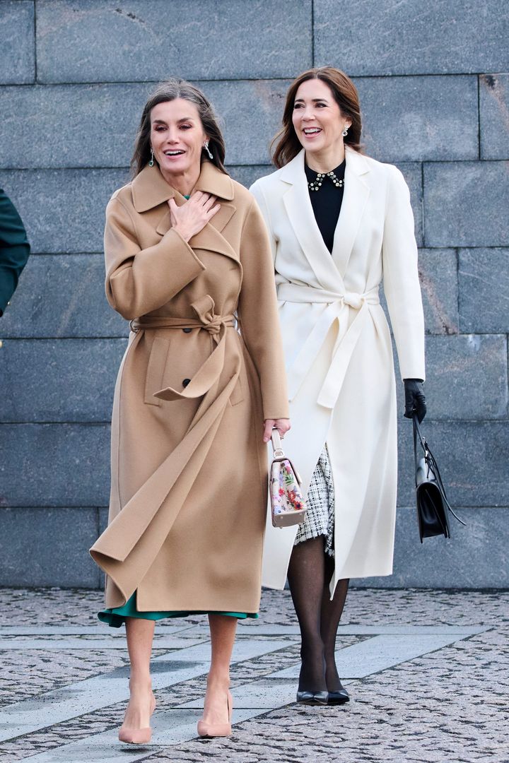 2023年11月、スペイン国王夫妻がデンマークを訪問中のワンシーン。ベージュとホワイト、ともにニュートラルカラーのラップコートに小ぶりなハンドバッグを合わせて。ともに元キャリアウーマンならではの知性とエレガンス漂う装いです。
