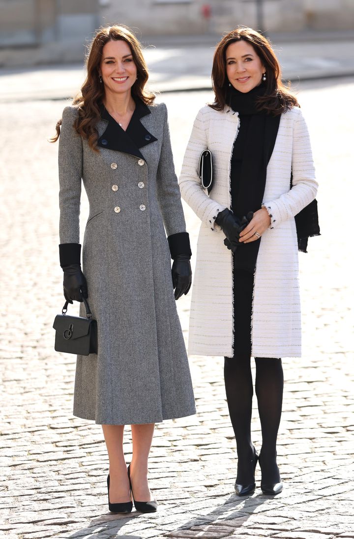 まるで姉妹のようと評されることの多い二人。2022年2月、デンマークを訪問したキャサリン皇太子妃は、キャサリン・ウォーカーのグレーのカシミアコートを、メアリー王妃は白のツイードコートをコーディネート。グレー、白、黒のニュートラルカラーでまとめた洗練ムードあふれる装いです。