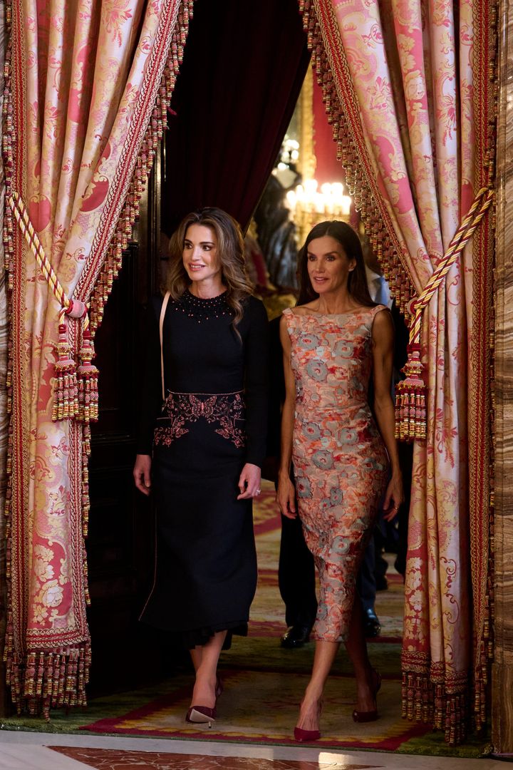 その知的でエレガントな佇まいが似ている二人。写真は2023年6月、ヨルダン国王夫妻がスペインを公式訪問した際のワンシーン。ラーニア王妃は、精巧な刺しゅうが施されたディオールのドレスを、レティシア王妃はスペイン人デザイナー、ディエゴ・エストラーダが手掛けたブロケードのフローラルドレスを着用。
