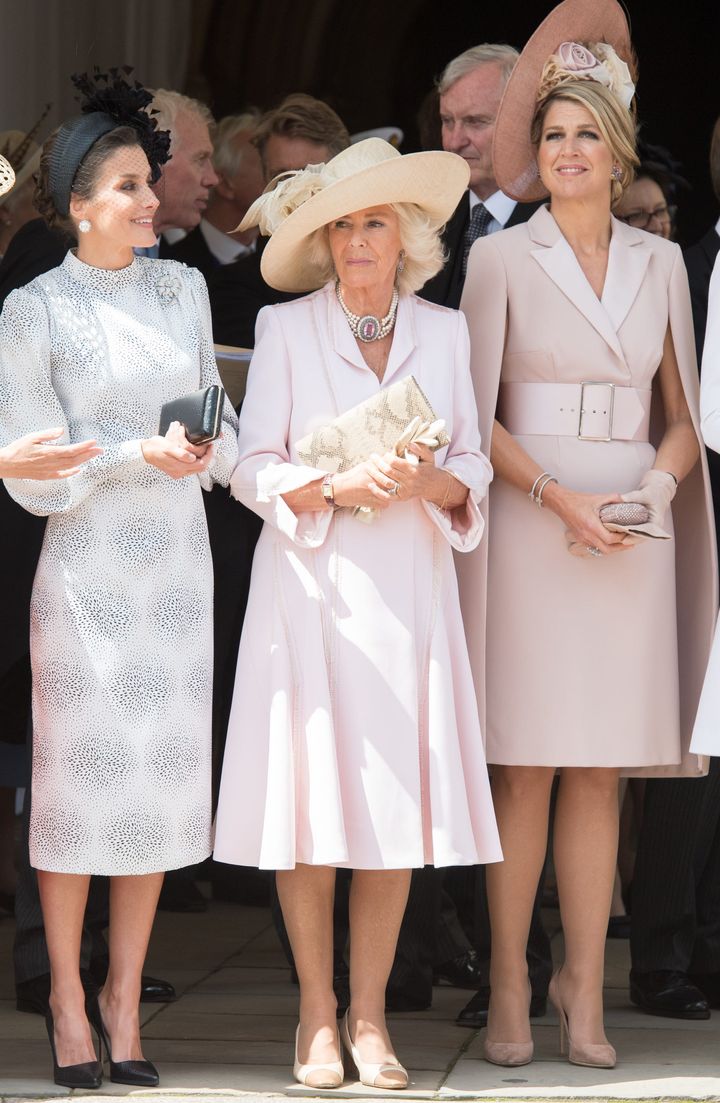 2019年6月、ウィンザー城のセント・ジョージ礼拝堂で行われたガーター勲章授与式での珍しい3ショット。グレー、ピンク、ベージュの淡いカラーのドレスに、コンパクトなクラッチバッグを合わせて。デザイン性の高い帽子がアクセントに効いています。