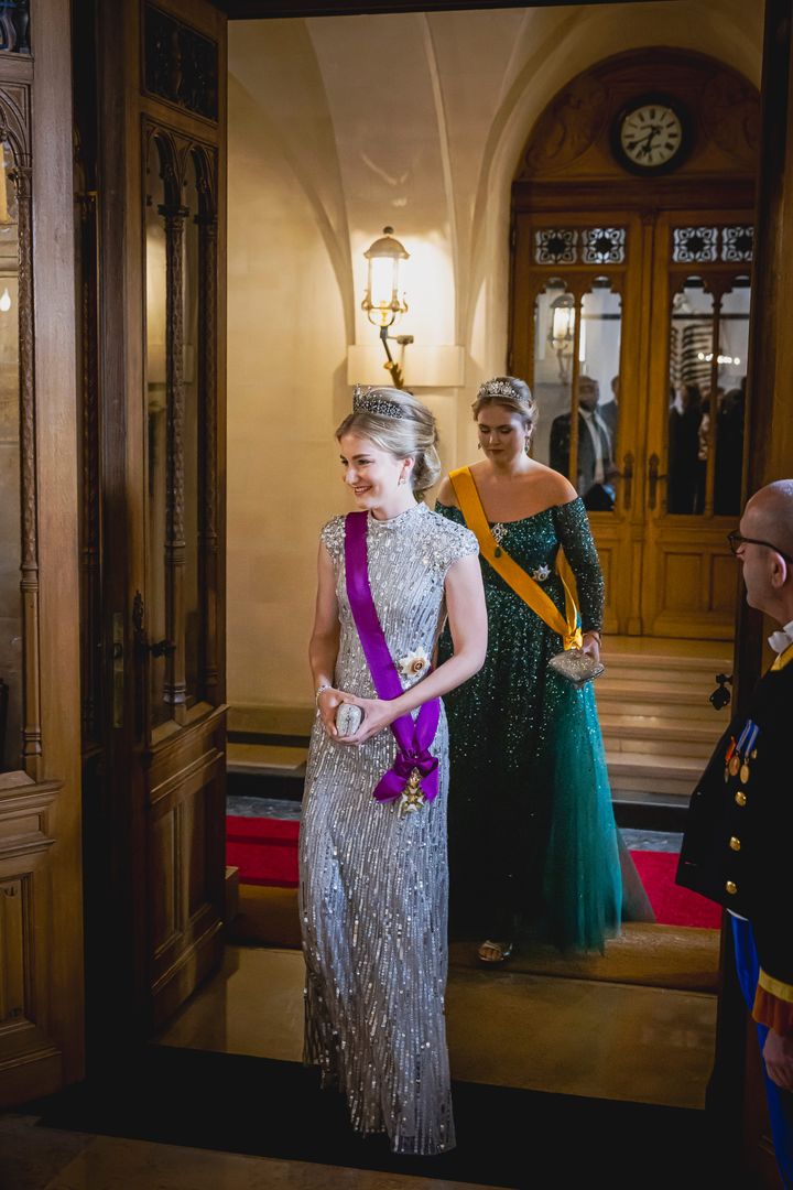 2025年10月、ルクセンブルク大公ギョームの即位を記念する祝賀晩餐会にて。エリザベート王女は、ジェニー・パッカム、カタリナ=アマリア王女は、モニーク・ルイリエのドレスをチョイス。ともに、スパンコールやビジューの装飾が煌めき、華オーラ満点です。