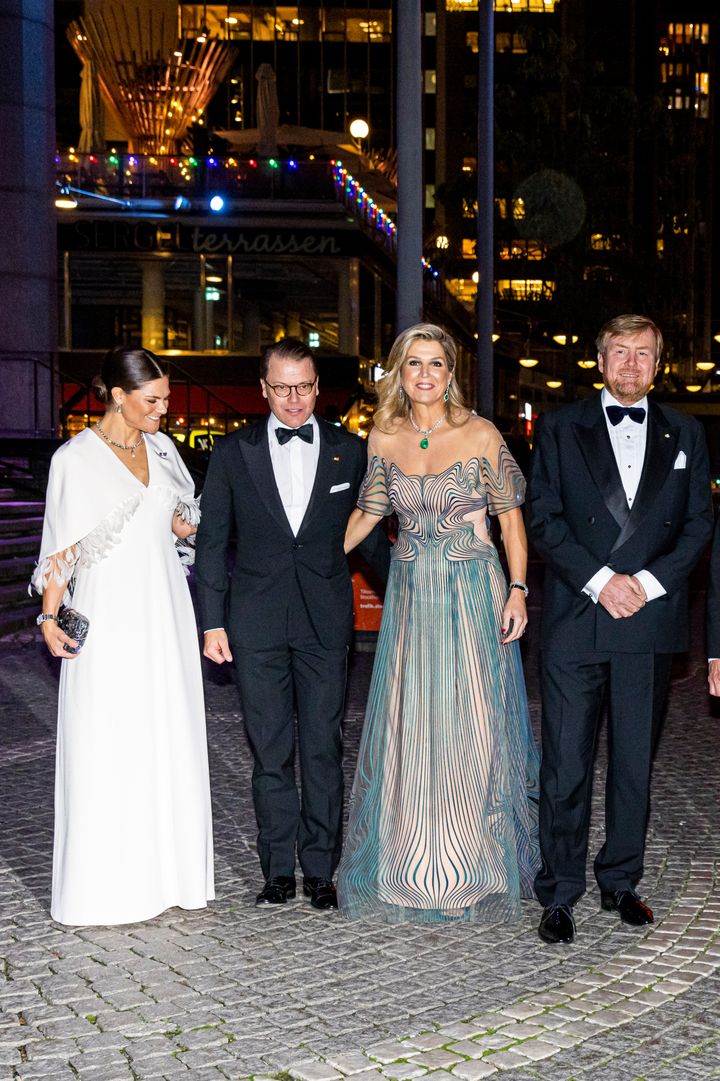 2022年10月、スウェーデンを訪問したオランダ国王夫妻。夜に行われたコンサートにて、ヴィクトリア皇太子は袖にフェザーがあしらわれたトーテムの白ドレスを、マキシマ王妃はグラフィカルなデザインがモダンなイリス・ヴァン・ヘルペンのドレスをチョイス。