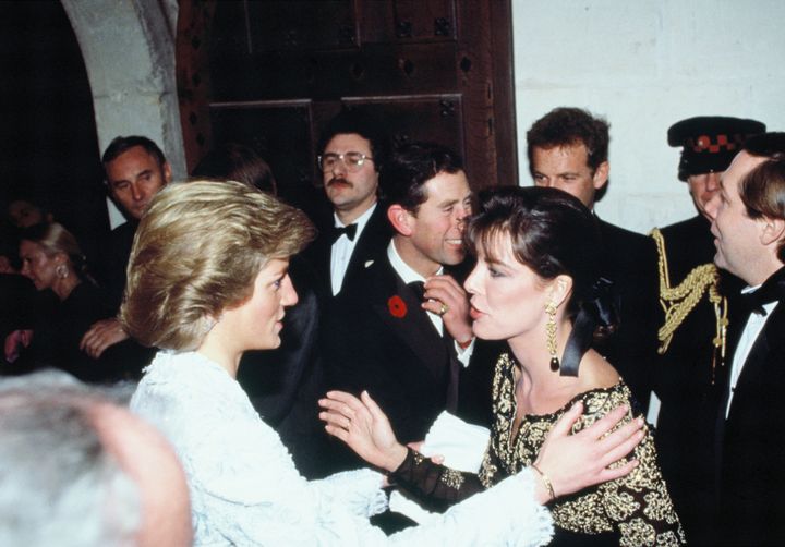 1988年11月、シャンボール城で行われたフランス政府主催の晩餐会にて。当時最も注目されていた二人のプリンセスの貴重なワンシーン。ダイアナ元妃は、キャサリン・ウォーカーの白のラップドレス、カロリーヌ公女はゴールドの刺繍が施されたブラックのベルベットドレスをまとって。