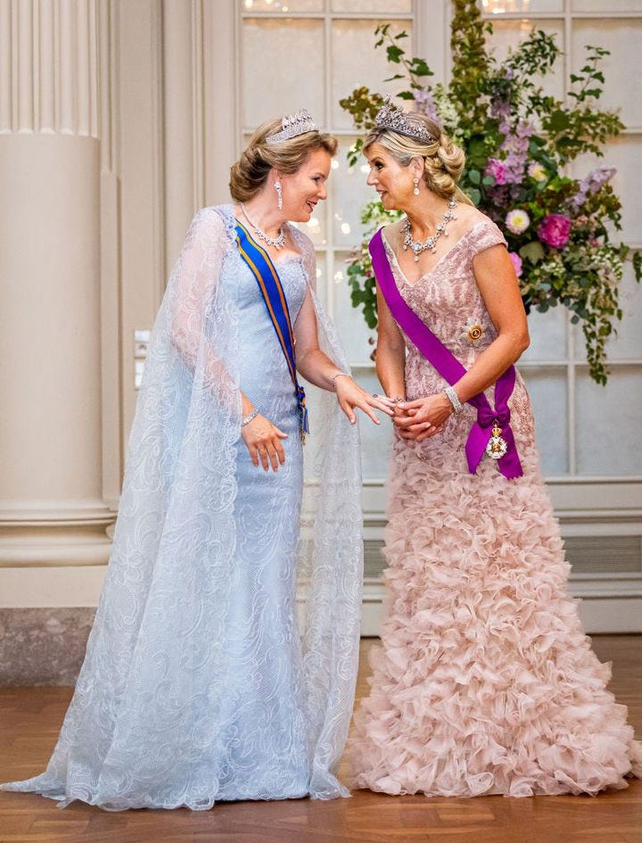 2023年6月、ベルギーで行なわれたオランダ国王夫妻を招いての国賓晩餐会にて、仲睦まじく談笑する二人の王妃。淡いブルーのレーシーなケープドレスとピンクのラッフルドレス、ティアラを始めとするジュエリー使いもまるで双子のようなリンクコーデです。