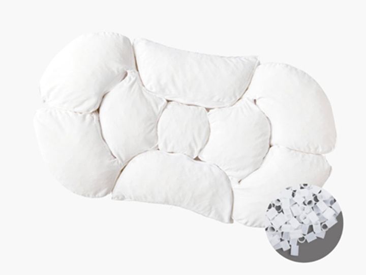 その日の自分にちょうどいい枕をセルフメンテで。9つのパーツが連結されたユニットが頭や首にフィットし、負担を軽減。¥49,500/ロフテー